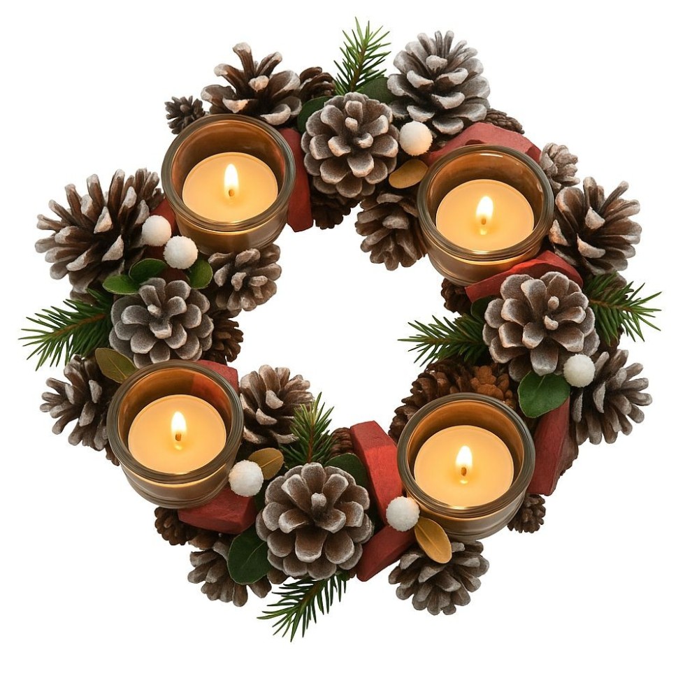 Vneste do svého domova hřejivou atmosféru s tímto elegantním adventním svícnem o průměru 32 cm. Svícen je bohatě zdoben přírodními šiškami, zelenými větvičkami, jemnými červenými akcenty a dekorativními bílými kuličkami, které připomínají sněhové vločky.