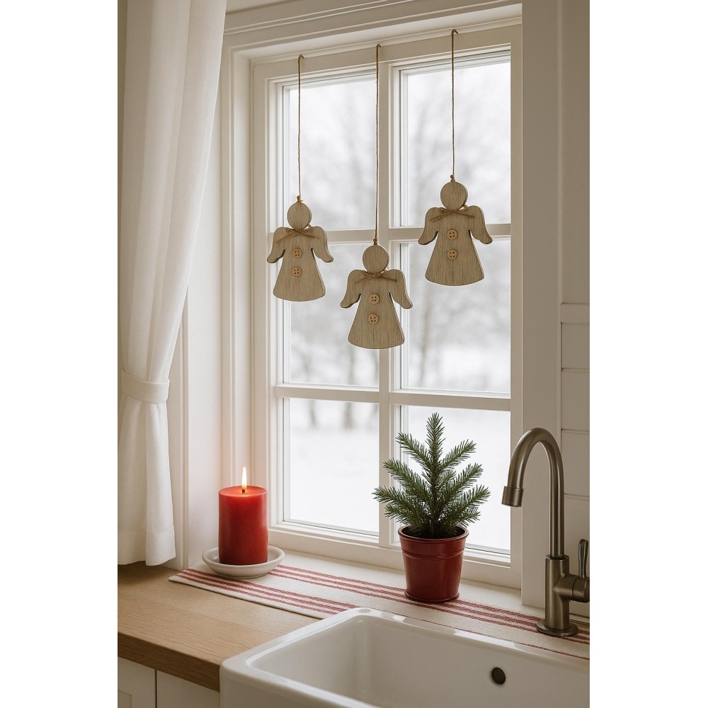Jednoduchý a elegantní andělíček z přírodního dřeva MDF ozdobený provázkem a dřevěnými knoflíčky. Díky svému přírodnímu vzhledu se skvěle hodí k rustikální i moderní vánoční výzdobě. Ideální na zavěšení na stromek, věnec nebo do okna.