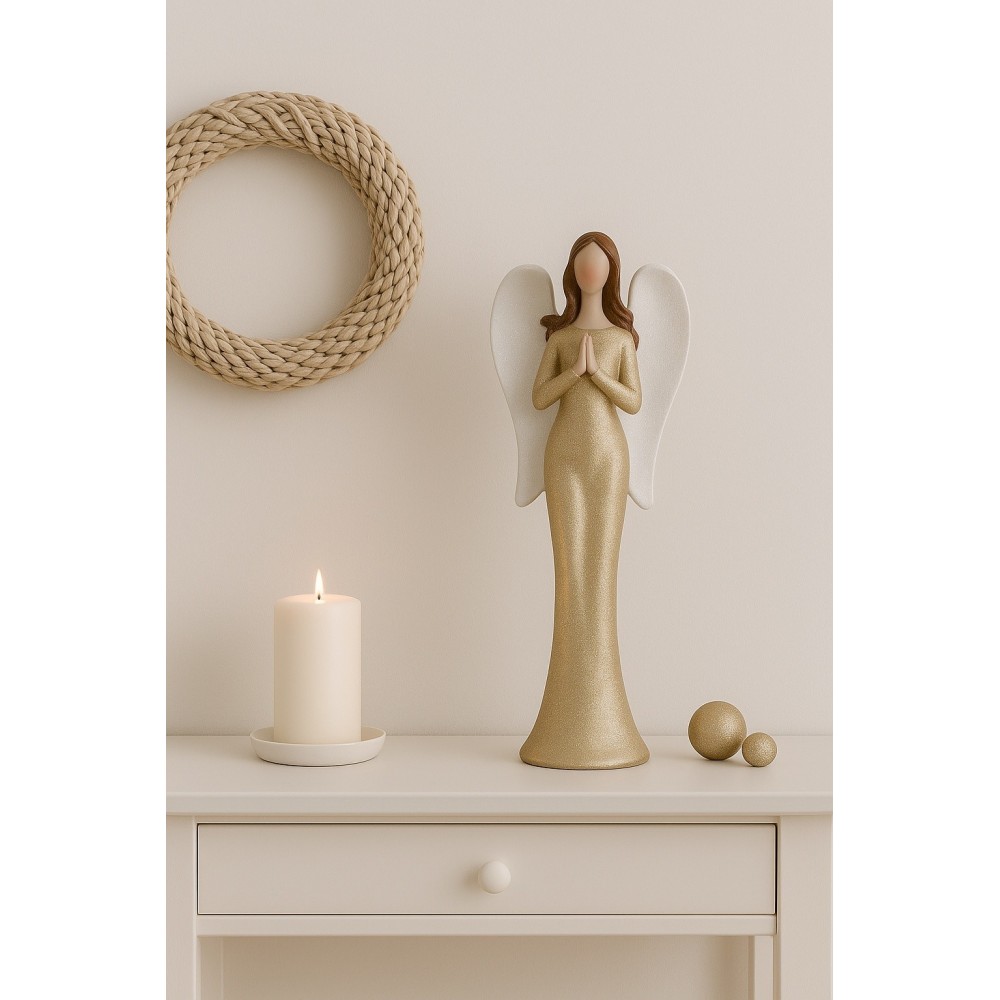 Elegantní anděl z keramiky ve zlatých třpytivých šatech s bílými křídly působí důstojným a klidným dojmem. Složené ruce a jemné provedení z něj činí krásnou dekoraci, která ozdobí váš interiér během Vánoc i po celý rok.