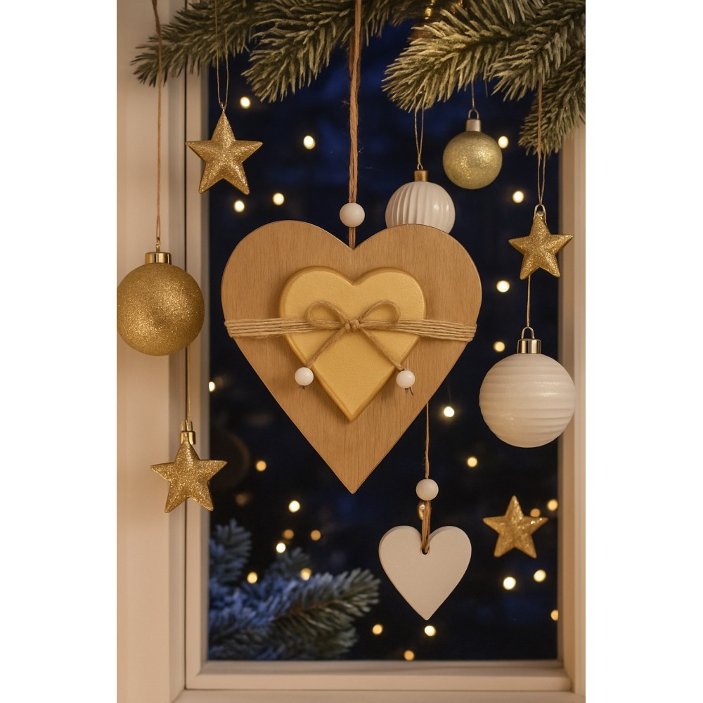 Elegantní závěsná dekorace ve tvaru srdce z MDF dřeva kombinuje přírodní vzhled s decentním zlatým třpytem. Menší zlaté srdce je upevněno uprostřed většího přírodního, ozdobené provázkem s mašlí a korálky. Vhodné k zavěšení na vánoční stromek, dveře, okno nebo jako celoroční dekorace.