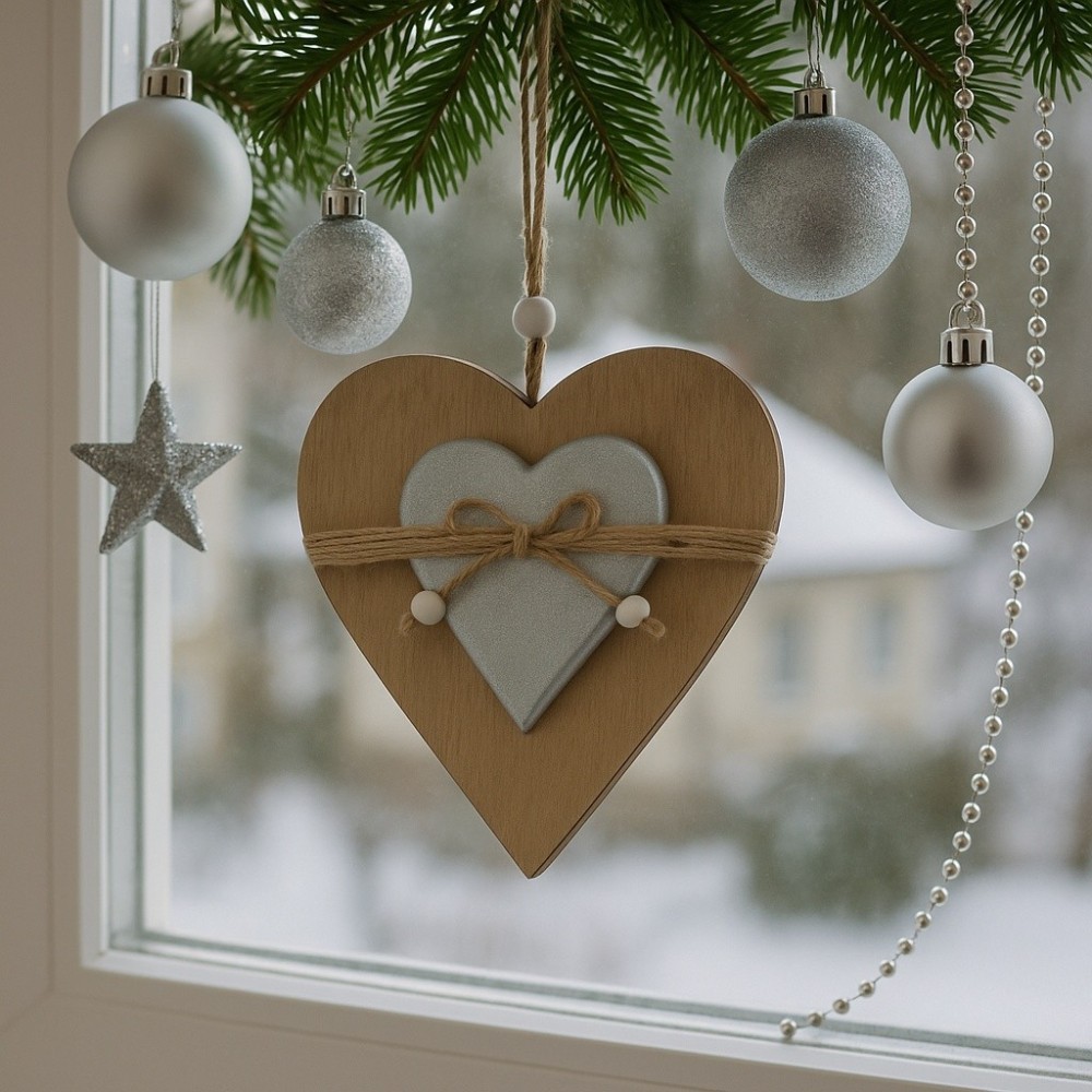 Elegantní závěsná dekorace ve tvaru srdce z MDF dřeva kombinuje přírodní vzhled s decentním stříbrným třpytem. Menší stříbrné srdce je upevněno uprostřed většího přírodního, ozdobené provázkem s mašlí a korálky. Vhodné k zavěšení na vánoční stromek, dveře, okno nebo jako celoroční dekorace.