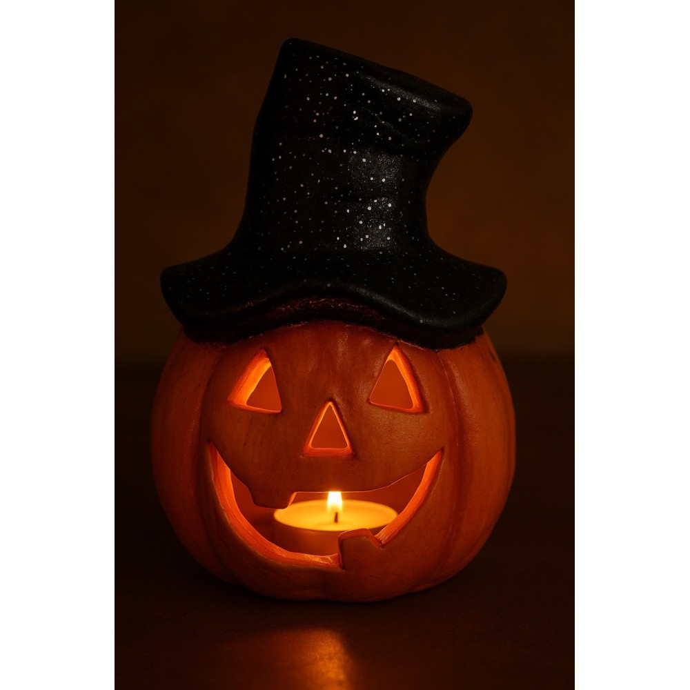 Stylový keramický svícen ve tvaru usmívající se dýně s čarodějnickým kloboukem je ideální dekorací pro podzimní a halloweenskou atmosféru. Po vložení čajové svíčky se jeho výřez krásně rozzáří a vnese do interiéru kouzelné světlo.