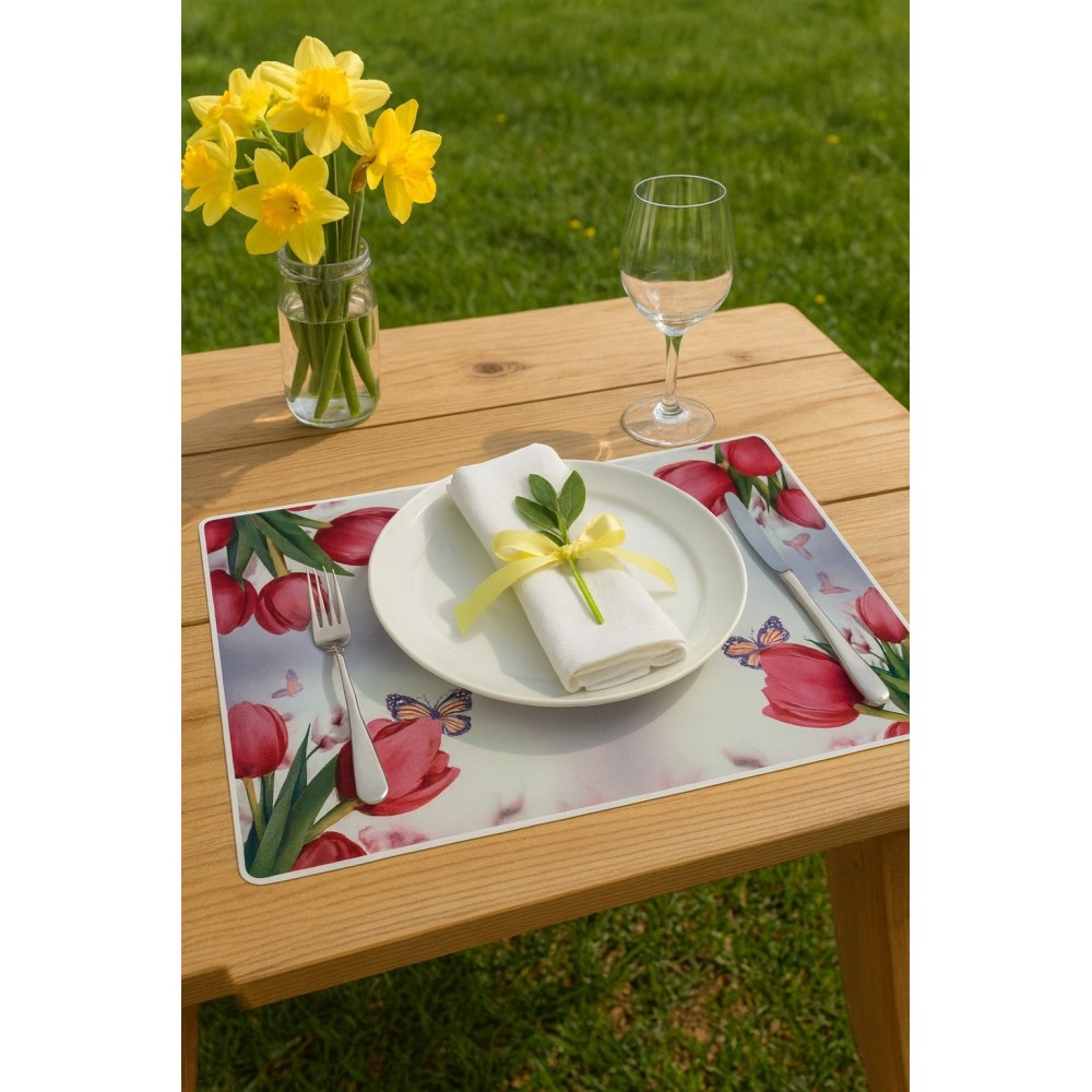 Elegantní omyvatelné prostírání s jemným motivem červených tulipánů a poletujících motýlů vnese do vašeho stolování jarní svěžest a romantický nádech. Praktické a zároveň dekorativní, vhodné pro každodenní použití i slavnostní příležitosti.