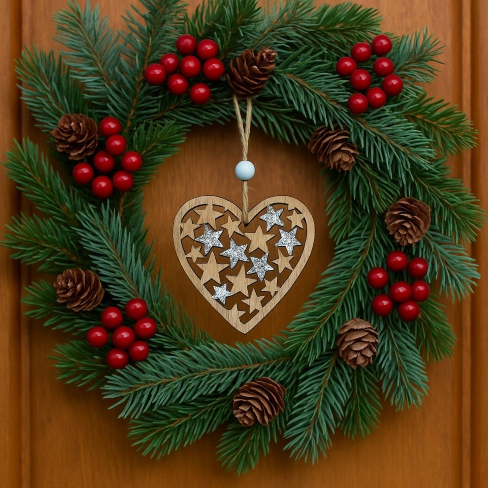 Krásná závěsná dekorace ve tvaru srdce z MDF dřeva je zdobená vyřezávanými hvězdami s jemnými stříbrnými třpytkami. Díky jutovému provázku lze snadno zavěsit na vánoční stromek, do okna nebo použít jako součást zimní výzdoby.