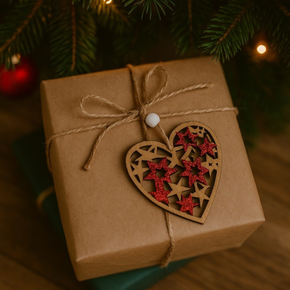 Stylová závěsná dekorace ve tvaru srdce z MDF dřeva je zdobena vyřezávanými hvězdami s červenými třpytkami. Díky provázku lze snadno zavěsit na vánoční stromek, do okna nebo využít jako doplněk k zimní výzdobě.
