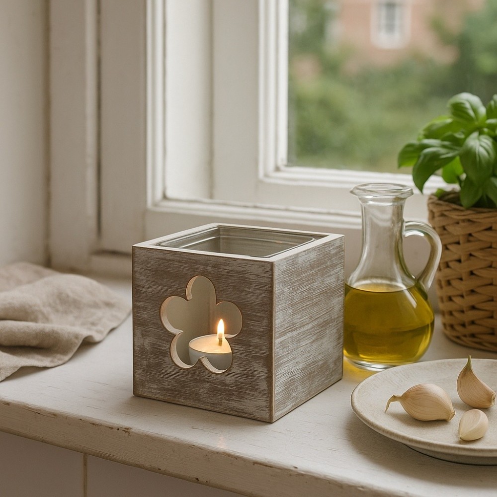 Tento elegantní dřevěný svícen s výřezem ve tvaru květu rozzáří každý interiér svým jemným rustikálním kouzlem. Díky většímu rozměru a kombinaci přírodního dřeva se skleněnou vložkou se skvěle hodí jako výrazný dekorační prvek nejen doma, ale i na terase či slavnostně prostřeném stole.