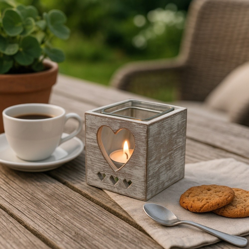 Malý, ale působivý dřevěný svícen s výřezem ve tvaru srdce a jemným dekorem pod ním okouzlí každého milovníka rustikálních doplňků. Skvěle se hodí pro čajovou svíčku a díky svému rozměru jej snadno umístíte na stůl, polici či parapet. Skleněná vložka zajišťuje bezpečné použití.