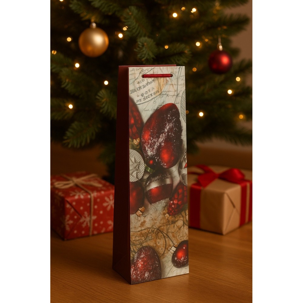 Stylová dárková taška ideální pro balení lahví vín či jiných nápojů. Pevný papír s vyšší gramáží zajišťuje odolnost, zatímco matný povrch a detailní vánoční motiv působí elegantně a slavnostně. Díky praktickému uchu z kroucené šňůrky je přenášení snadné a pohodlné.