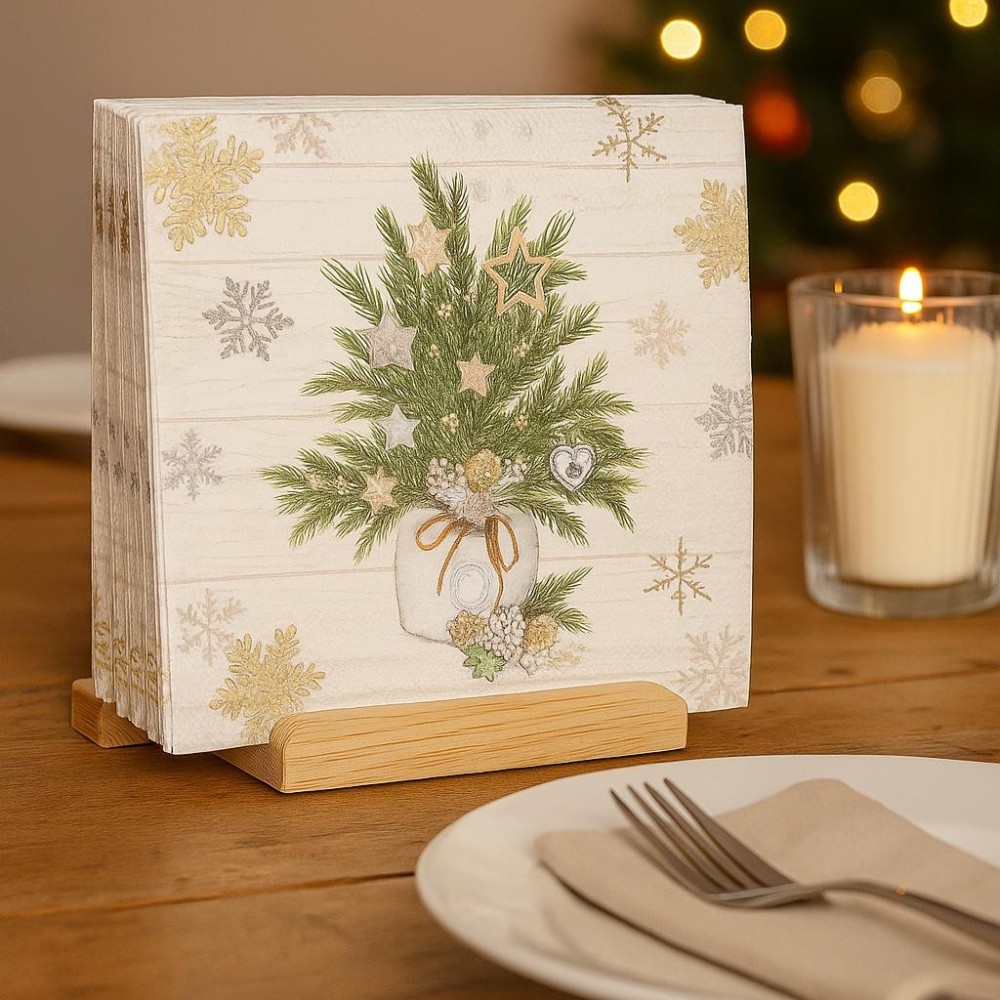 Elegantní 3vrstvé papírové ubrousky s jemným vánočním motivem větviček v ozdobné váze, doplněné hvězdičkami a sněhovými vločkami. Skvěle se hodí pro sváteční stolování i zimní dekorace.
