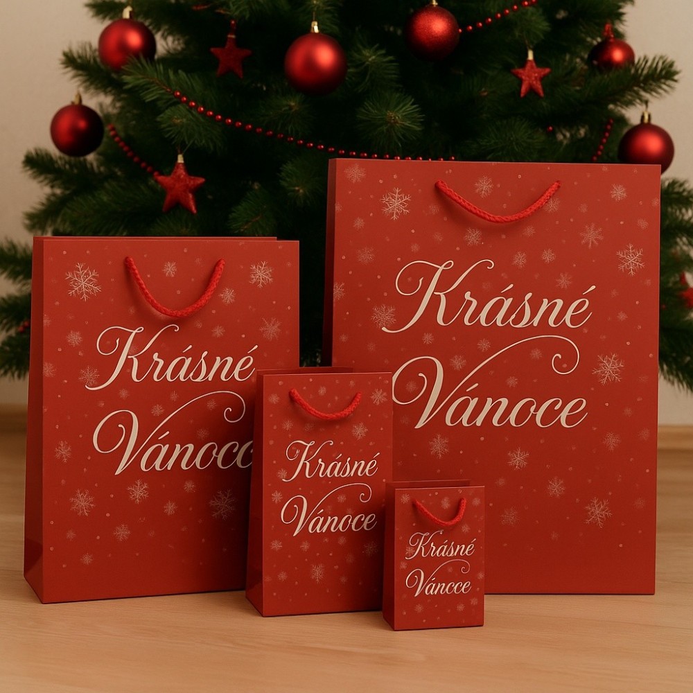Elegantní vánoční dárková taška v červeném provedení s nápisem Krásné Vánoce a motivem vloček. Matný povrch s kvalitním potiskem působí slavnostně a decentně. Pevné kroucené polyesterové ucho zajistí pohodlné přenášení. Vhodná pro středně velké dárky.