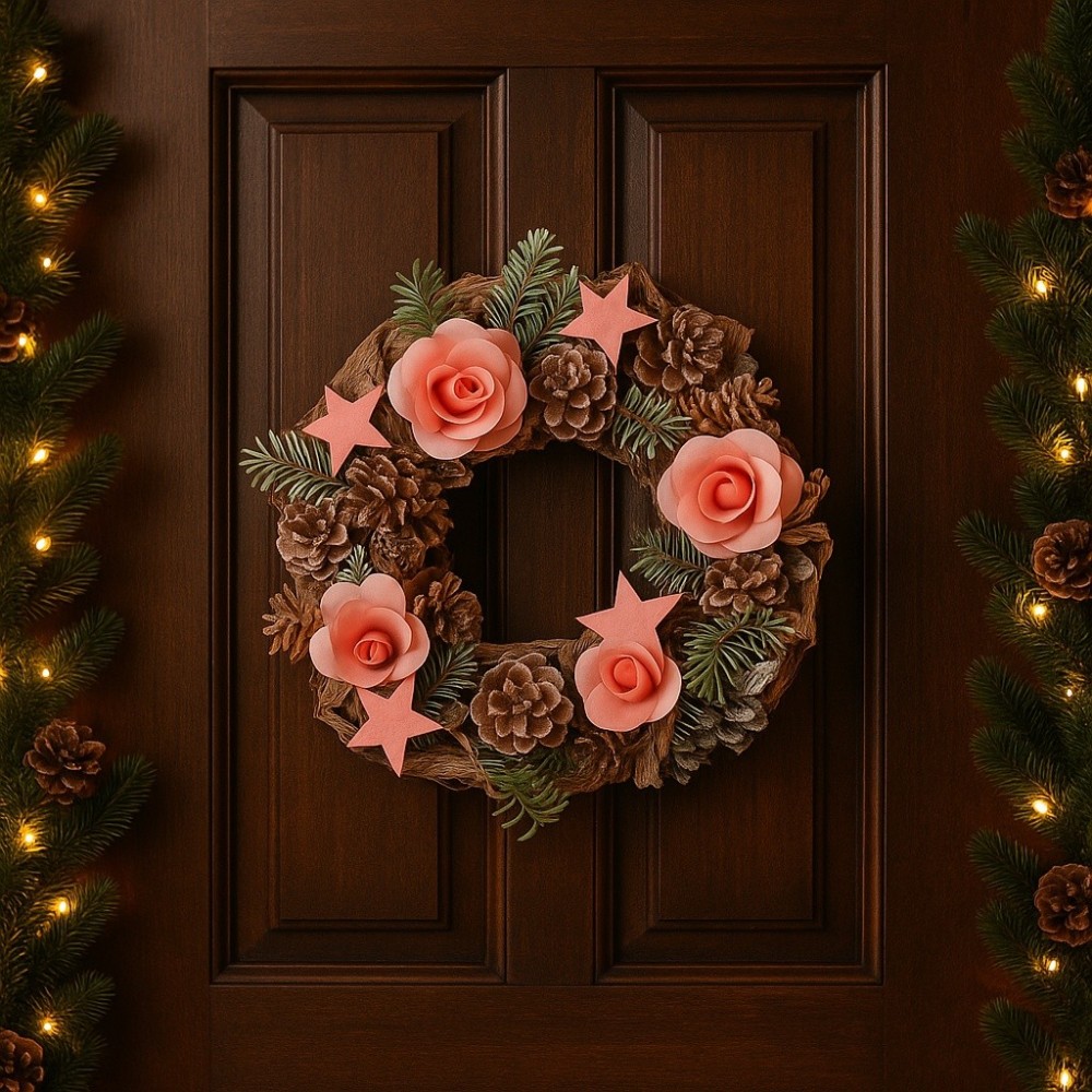 Elegantní vánoční věnec v přírodním stylu, který vnese do vašeho domova jemnou a romantickou atmosféru. Zdobený růžovými růžemi, dřevěnými hvězdičkami, šiškami a větvičkami jehličí působí originálně a vkusně. Vhodný k zavěšení na dveře, stěnu nebo jako středová dekorace na stůl.
