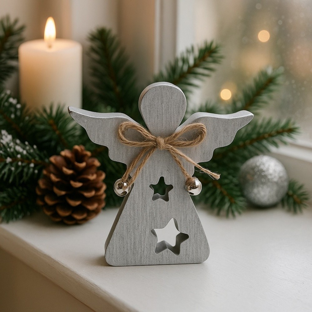 Elegantní dřevěný anděl v přírodním odstínu s bílým dekorem vnese do vašeho domova kouzlo Vánoc. Díky svému jemnému provedení s mašličkou a rolničkami je ideální jako sváteční dekorace na poličku, stůl či parapet.