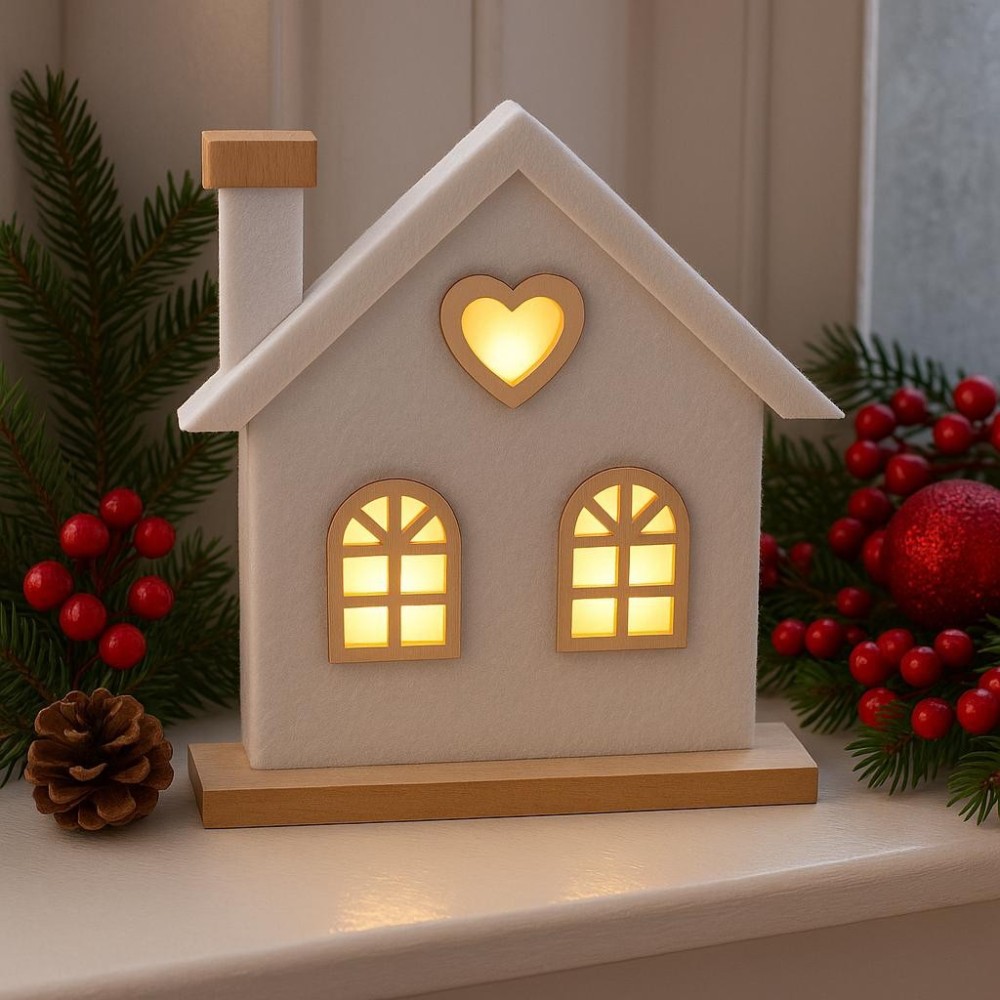Tato roztomilá svítící dekorace ve tvaru domečku s komínem a srdíčkovým okénkem rozzáří každý kout vašeho domova. Díky teplému bílému tónu a jemnému světlu působí hřejivě a útulně. Hodí se jako zimní dekorace, ale potěší i během celého roku například v dětském pokoji nebo na poličce v kuchyni.