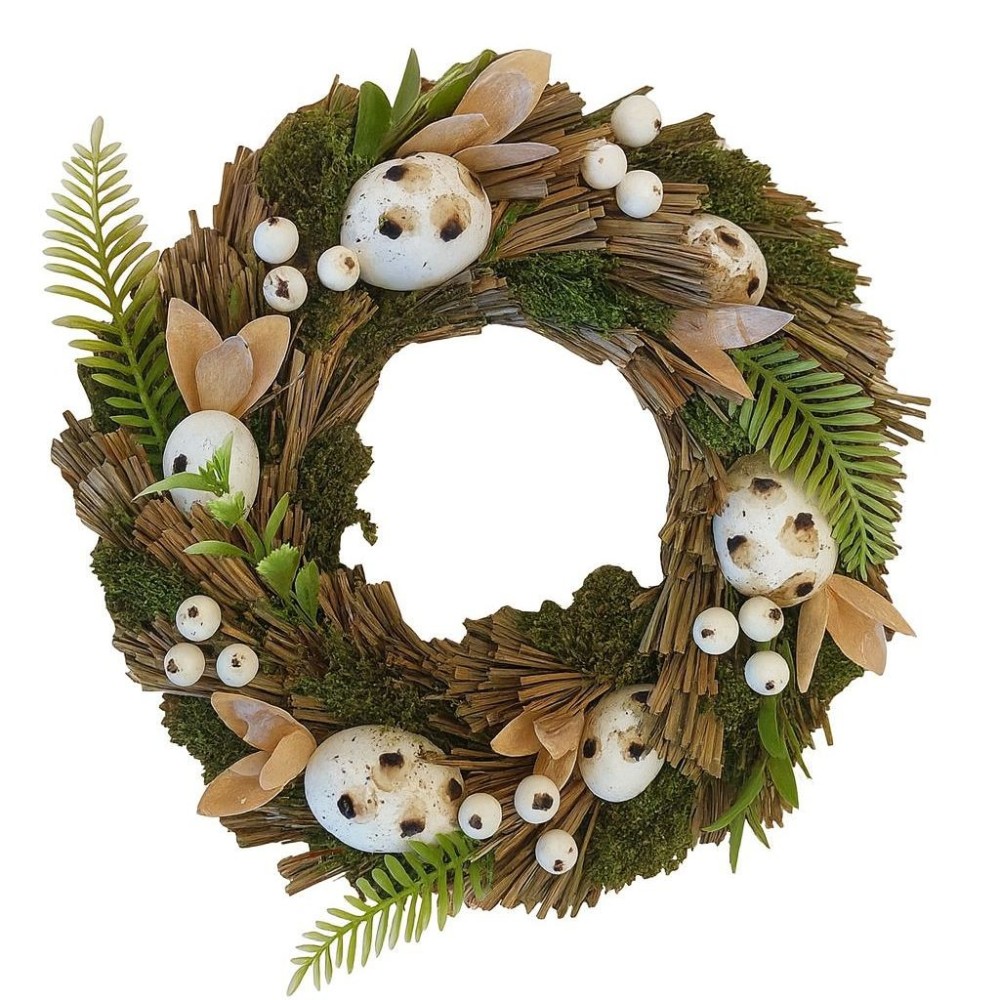 Elegantní jarní věnec vyrobený z přírodních materiálů, zdobený textilními prvky, zelenými lístky a bílými detaily. Věnec působí svěže a přirozeně, je ideální pro velikonoční a jarní výzdobu dveří, stěny či stolu. Díky svým barvám ladí s přírodními i moderními interiéry.