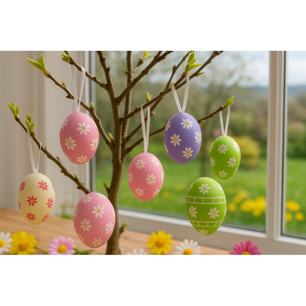 Krásná sada plastových vajíček v pestrých jarních barvách s jemnými květinovými motivy rozzáří každou velikonoční výzdobu. Díky bílým stužkám je snadno zavěsíte na větvičky, okna či velikonoční věnce.