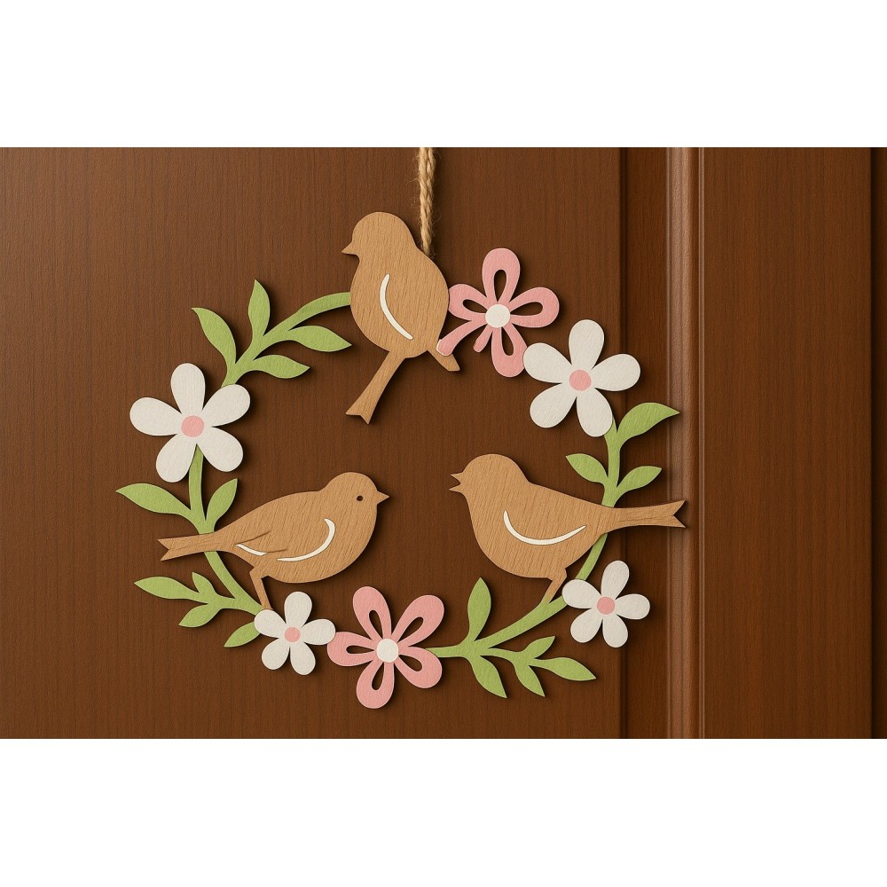 Tento jemně zdobený věnec z MDF dřeva přináší do vašeho domova přírodní kouzlo a lehkost jarní atmosféry. Dekor tvoří tři siluety ptáčků zasazené mezi květy v bílých a růžových tónech, doplněné zelenými lístky. Díky praktickému jutovému provázku jej snadno zavěsíte na dveře, stěnu či okno, kde se stane půvabnou ozdobou.