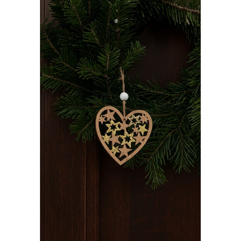 Krásná závěsná dekorace ve tvaru srdce z MDF dřeva je zdobená vyřezávanými hvězdami s jemnými zlatými třpytkami. Díky jutovému provázku lze snadno zavěsit na vánoční stromek, do okna nebo použít jako součást zimní výzdoby.