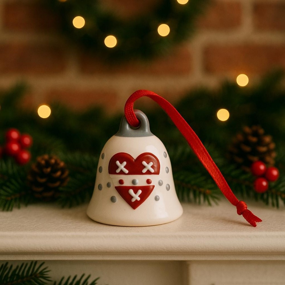 Tento drobný keramický zvoneček v tradičním červeno-bílém provedení krásně doplní vaši vánoční nebo zimní výzdobu. Díky červené stuze jej snadno zavěsíte na stromeček, věnec či okenní dekoraci. Jemný motiv srdce a plastické zdobení působí mile a rustikálně.