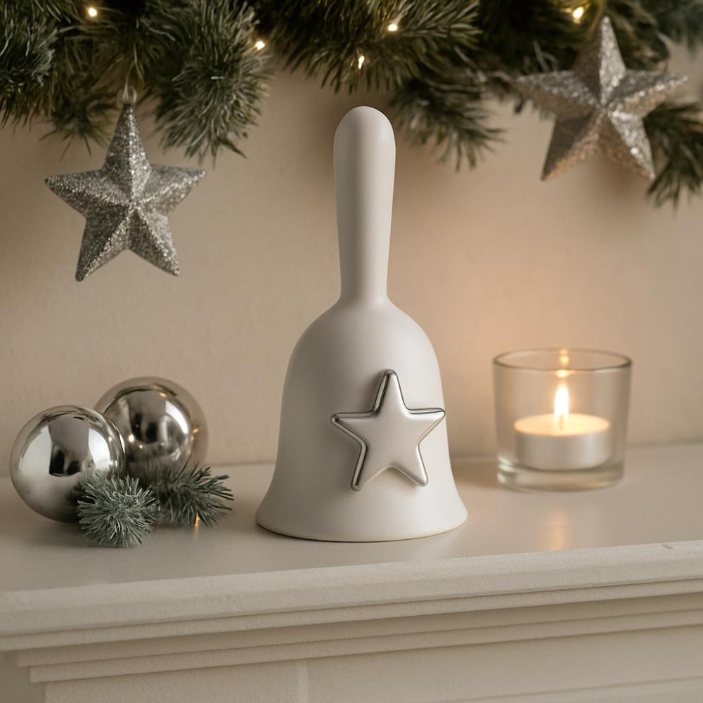 Elegantní keramický zvoneček v bílé barvě s výrazným plastickým motivem stříbrné hvězdy zaujme svým čistým a moderním designem. Díky hladkému povrchu a decentnímu lesku se skvěle hodí do minimalistické i slavnostní vánoční výzdoby.
